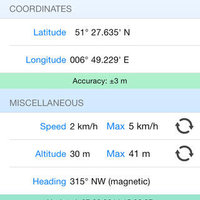 Please keep in mind that the accuracy of your position and acceleration always depends on the intensity of the available GPS signal. Compass and heading information are only available on devices with magnetometer (iPhone3 GS or newer and iPad).