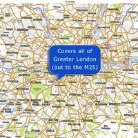The map covers 3743 sq km (1445 sq miles) of London down to street level, the same area as the printed version of the Master Atlas of Greater London and extends beyond the Greater London and M25 area to Hemel Hempstead, St Albans, Potters Bar, Waltham Cross, Epping, Brentwood, Thurrock, Stanford-le-Hope, Gravesend, Wrotham, Sevenoaks, Westerham, Oxted, Redhill, Reigate, Leatherhead, Great Bookham, Woking, Egham, Windsor, Slough, Chalfont Street Peter, Chorleywood and Bovingdon.