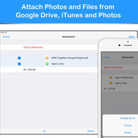 - Attach photos and files from Google Drive, iTunes and Photos;