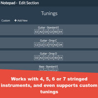 - Add any number of strings and custom tunings including 4,5,6 and 7 string guitars/bass guitars