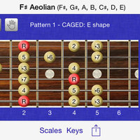 Learn scales by seeing and playing along with five patterns that cover the full fretboard for each scale. Scale positions correspond to the popular CAGED system. The CAGED system chord shape for the current position of a scale is displayed to help you learn and remember scale positions in any key.