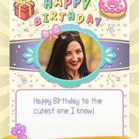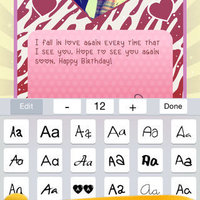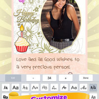 Choose one of the eight categories: browse through and you'll find cute, vintage cards, cards for family and kids, girly cards, as well as cards for sweetheart. You'll also find sweet 16 birthday cards, and finally cards for everyone. Choose one card from these categories, upload a photo from the gallery of your phone, or take a new photo, keep the original writing on the card or change it, customize the written text and change font. Finally sign the bottom of the card and give your personal touch! You'll have a unique birthday card to send to your loved ones!
