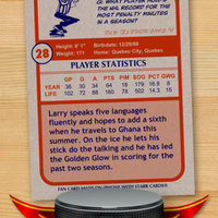 The backsides of cards are replete with entertaining hockey trivia including a cartoon Q & A section, fast facts, insider capsules, and the best quotes from the history of the sport.