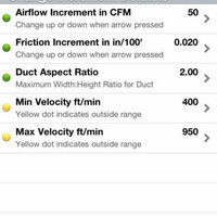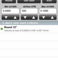 Considering galvanized vs. Flex? Change the material from Flex to galvanized and HVAC Duct Calc Buddy evaluates sizes meeting your remaining criteria and displays all matching choices. With each design parameter change there is no need to and retry 8x10, 10x12, etc. to see velocities and friction for each as all valid combinations are displayed. It’s easy to adjust your selection and or ranges by pressing up or down arrows as appropriate to expand or contract the list of suitable ducts.