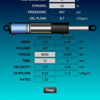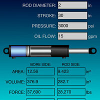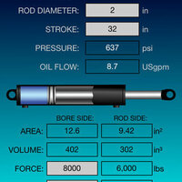 Cylinder characteristics can be entered in a number of different ways. Enter hydraulic flow, cylinder velocity, or stroke time and calculate the other two. User can also enter Hydraulic pressure, extend force or retract force and have the other two calculated.