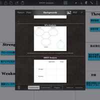 It allows you to generate a large number of ideas using a wide variety of thinking methods.In addition, it has a carefully selected range of high class frameworks designed to help professionals with their planning tasks.It includes classic frameworks such as 3C, 5 Forces, and SWOT analysis, to the latest innovative theories such as Blue Ocean Strategy, and Business Model Canvas. The frameworks can be very useful for helping you think of new ideas from a variety of angles, so generating new ideas in line with the frameworks can be extremely effective. Of course, you can also create and save your own framework by writing it on a canvas. You can also import photos or PDF files into the background, providing you with great flexibility.