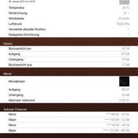 - Weather - General condition, temperature, wind direction, and moon phase.