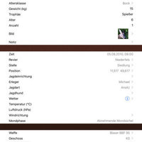 + Observations. Observations support the attributes game type, amount, age, description, and hunting area including picture. For every event, you can add event data such as time, location, GPS position, and weather - saving you from repeating common information. Using observations and assigning pictures is ideal for trail cam owners wanting to track down behavior and visits of individual game.