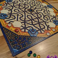 On a turn, a player places a tile on any space on the game board, with the only restriction being that a player cannot create a route directly from one goal to another. Each tile has three route segments on it, connecting one pair of edges. If a player places a tile next to a gemstone, that gemstone "moves" as far as possible along the route so that all players can see where to place tiles to next move that gemstone. (Thus players avoid the mental gymnastics required in Metro and Linie 1 in which nothing moves until a route is complete.) When connecting to the central tile, the green gems move off first, with the indigo gem moving only with the sixth connection.