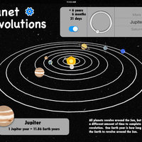 The planets are shown orbiting the Sun at their comparative speeds. Selecting Neptune reveals it takes 164.8 Earth years to orbit the Sun once while the inner planets seem to orbit the Sun at a dizzying speed. Select Mercury, with a year of 88 Earth days, and the outer planets barely seem to move at all.