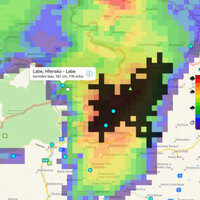 Radarová data použitá v této aplikaci zobrazují pole maximalních radiolokačních odrazivostí sloučených z radarů Brdy-Praha a Skalky.
