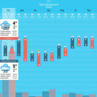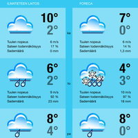 Katso lämpötila, sataako vai paistaako ja tuulen suunta tunneittain vuorokaudeksi eteenpäin. Mukana on myös tuntuu kuin -lämpötila, jossa huomioidaan tuulen vaikutus. Lisäksi sovelluksesta löytyy siitepölyennuste Suomessa sijaitseville paikkakunnille.