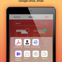 Save your multi-pages scanned documents as PDF, JPEG, PNG, TXT files, synchronize between devices using Dropbox, Evernote, as well as the «Open in» feature, by which the document can be imported into any other application that supports the above mentioned file formats (Word, Excel, Access, Power Point, Photoshop), send documents via E-mail, print them in one single tap, and much more!