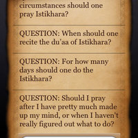 The application also lists answers to frequently asked questions on Istikhara and allows the user to email additional questions to a local scholar. Answers to emailed questions will be incorporated in a future update of the application.