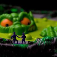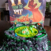 The object of the game is to land on the treasure chest, but don't get grabbed by It From The Pit. A large plastic board with a deep center well houses the large motorized monster that reaches up onto the board throughout the game while players move on one of two paths at the rim of the pit. The inner path is shorter, but is easier for the monster to reach. The monster is turned on at the start of the game and continues grabbing players until the game is over. Players roll dice and quickly move their explorer around the pit. At any time during the game, if the monster grabs your explorer and pulls it down into the pit hole, that explorer is out of play. If the monster just knocks the explorer over or moves it to another space the explorer is still in the game. The first player to reach the treasure chest space by exact count wins the game. If all the explorers are pulled into the pit, then "It" has won the game.