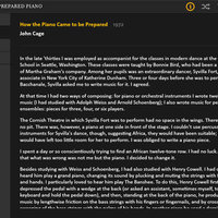 The sounds of John Cage's prepared piano are now available for you to play on your iPad with this innovative app. Play meticulously sampled sounds of a piano prepared with the actual materials used by John Cage in the preparations for his Sonatas and Interludes (1946-48) as sampled under the supervision of the John Cage Trust.