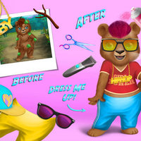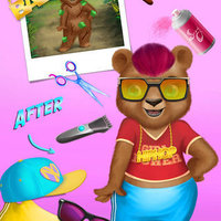 Baby bear Kim looks cute even with tree leaves and sticks stuck in her fur but it’s makeover time! Style her for tonight’s hip hop music concert: first wash, cut and dye Kim’s hair in hot pink, then design her a super cool outfit with golden jewelry, sunglasses and stylish full cap!