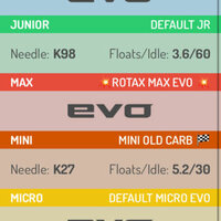Jet, needle clip and spark plug type for EVO and non EVO Senior, DD2, Junior, Mini and Micro Rotax MAX karting engines.