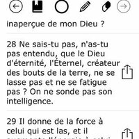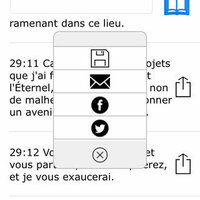 Parce qu'une partie de la joie de lire la bible est de partager nos inspirations et idées avec les autres, vous pouvez partager des versets bibliques, des prières et des pensées personnelles sur facebook, twitter et par e-mail