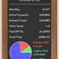 Try out various 'What-If' scenarios and quickly see how extra payments can save you a whole lot of time and money. You can enter any number of Monthly, Yearly or One Off extra payments, at any period during the loan. Then watch the total length and cost go down. You may be surprised by just how much!