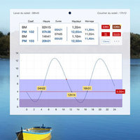 La courbe représente la hauteur d'eau en fonction des heures. Sur le graphique du jour un "flotteur" rouge indique le niveau de la mer. Un tap sur le flotteur affiche les détails dans la fenêtre supérieure (un tap dans le marégramme annule cet affichage).