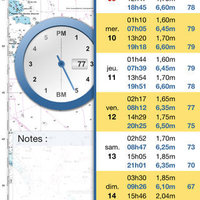 L'horloge vous donne l'état de la marée à l'instant T pour le port sélectionné. L'aiguille tourne dans le sens des aiguilles d'une montre. Lorsque l'aiguille est à droite du cadran, la mer descend de Pleine Mer à Basse Mer puis l'aiguille passe à gauche du cadran pour la marée montante (de basse mer à pleine mer). Le coefficient est indiqué dans le petite fenêtre de l'horloge.