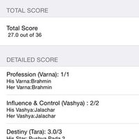Are you two compatible? Find out now. This technique of horoscope matching has been used by Indian Astrologers for centuries. It matches you and your partner's placement of moon at the time of birth. Eight aspects are matched for compatibility. The aspects are assigned points indicating their relative importance. The aspects with their maximum possible points are: