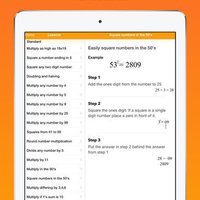 Amaze and delight others as you multiply, divide, and square at lightning fast speed. Learn and practice the tricks of mental math calculation in a fun and engaging application. Study any of the math tricks and then practice them as you progress through various levels of proficiency. Tease your brain with a quick practice session while waiting in lines, riding in the car, or on the plane. Only the basic math skills of addition, subtraction and simple multiplication and division are needed to achieve astonishing results.