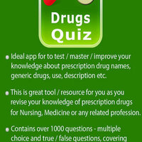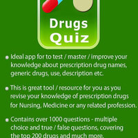 The app contains over 1000 questions - both true/false questions and multiple choice. It's great as practice app that you can use to test what you have learned or also as a refresher that you want to use as you prepare for or just before taking an exam. It will help you test your knowledge of drug names, use and description.