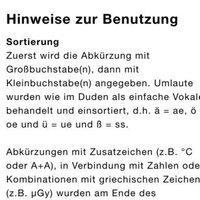 Über 200.000 gebräuchliche Abkürzungen, Akronyme, Mnemoniks und Symbole mit mehreren Suchmöglichkeiten und Hinweis auf Verwechslungsmöglichkeiten einschl. angloamerikanischer, französischer und lateinischer Abkürzungen.