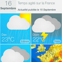 * Prévisions : prévisions globales pour la France à 3 jours, et pour toutes les villes de Frances et des milliers de villes en Europe ! (température, vent, direction du vent, humidité, pression, pluie... toutes les 3 heures) à 10 jours