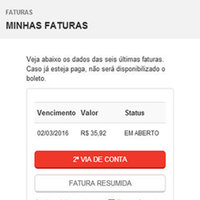 • Fatura: cliente Pós, Banda Larga Pós e Controle pode enviar sua fatura detalhada pro e-mail que desejar. Se preferir, dá pra checar os detalhes da conta ou um resumo no próprio app. Se quiser, também dá pra copiar o código de barras e colar direto na página do seu banco.