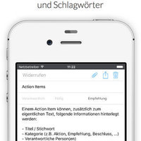 Assign a responsible person and a due date to an action item to track the status of all open, done and overdue items in your project. Categorize action items via tags and with the iPad camera you can take a picture of a flip-chart oder whiteboard and assign it directly to the appropriate item. In addition you can attach and view pictures and documents (Word, Excel, PDF, …) from your media library and your Dropbox.