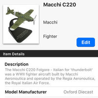 Quickly catalog, filter, sort, and manage all of the model planes you own. View information, images, and add personal details. Type, year, edition, country, and more!