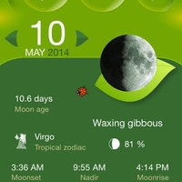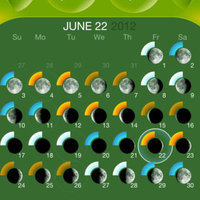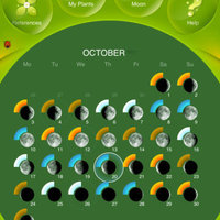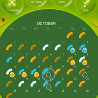 Full screen calendar displays Moon phases for the whole month along with Zodiac elements and watering events for your plants.