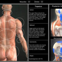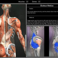 A reference for trigger points and referral patterns for 108 muscles. Features 160 trigger points with their corresponding referral patterns, 80 conditions that can be caused by trigger points, and 25 videos that show how to release specific muscles. Each muscle includes the visual referral pattern and point location, plus a written muscle action, referral, origin, insertion, nerve, comments, and audio pronunciation for each muscle. You can choose to view each muscle individually, or use the zones view to see all the muscles that refer into a specific area (or for a specific condition). This is a great help in discovering the source of pain.