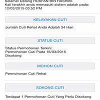 5. Status Cuti - Membolehkan pegawai membuat semakan status permohonan cuti samada telah disokong dan diluluskan