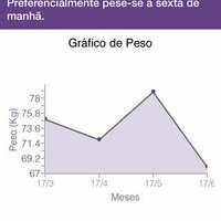 - Área pessoal - informação de perfil, peso de referência, registo de pesos (com visualização de gráfico de evolução) e diários alimentar e de exercício