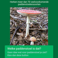 Met deze app kun je op eenvoudige wijze 70 paddenstoelensoorten herkennen. Dat doe je door eerst de plek van de paddenstoel te selecteren en dan de vorm van de paddenstoel. Vervolgens krijg je een overzicht van de paddenstoelensoorten die het beste passen bij jouw keuze. Als je een van de paddenstoelensoorten selecteert, krijg je een fraaie foto plus een beknopte beschrijving met de belangrijkste kenmerken.