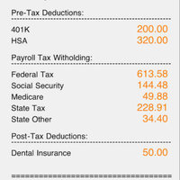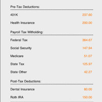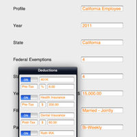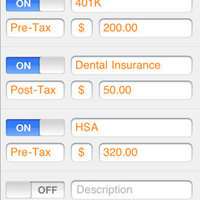 Payrollguru app allows up to 8 pre-tax and/or post-tax deductions, which are setup as a fixed amount deduction or a % of gross pay. Deductions are customizable and can differ from one profile to another. The deductions can be modified to accommodate various taxing scenarios. For example for 401K deduction - select pretax and turn ON Federal and State switches to exclude it from being taxed on federal and state levels.