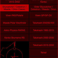 -Supports a multitude of polar scopes: iOptron, Astro-Physics RAPAS, various versions of Takahashi EM-10/11/200/400/500, NJP, PM-1, P2-Z, the latest Orion / Skywatcher, the Classic Skywatcher / Orion / Celestron / Meade, the Telrad, a couple for Astrotrac / Losmandy / Kenko / Avalon, the Tuthill Precision Polar Finder, the Meade 9x60 Polar Viewfinder and the Vixen Polaris and SX/SXD/SXP/AXD/GP/GP-DX/Polarie Polar Axis Scopes.