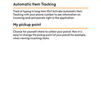 - Track sent and arriving items. Use the automatic item tracking system, which allows you to receive automatic updates on the item’s status through the application; enter the item ID yourself or use your camera to read the bar code. Direct your parcel to any of Posti’s pickup points to wait for your collection. The service is free of charge, but the user’s mobile number must be validated and the user must be registered.