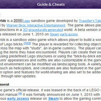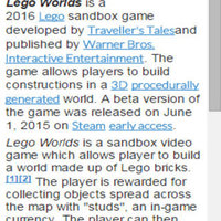 Lego Worlds is a sandbox video game which allows player to build a world made up of Lego bricks.[1][2] The player is rewarded for collecting objects spread across the map with "studs", an in-game currency. The player can then build using the items they have encountered. Players can create their own world by using predefined Lego structures or using the "brick-by-brick editor tool". Players' appearances and outfits are also customizable in the game. Terrain and environment can be modified via landscaping tools. A variety of vehicles, such as helicopters, and creatures are also featured in the game. A multiplayer option and features for world-sharing are also set to be added to the game through later updates.