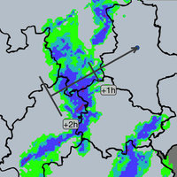 Außerdem kann eine Karte geladen werden, die den aktuellen Niederschlag und dessen Bewegungsrichtung zeigt.