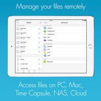 App connects to computers with Mac OS, Windows and Linux, work with files stored on Apple Time Capsule, NAS, WebDav, Cloud services (iCloud, OneDrive, Dropbox, Box, Google Drive)