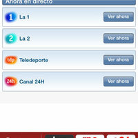 • TV en Directo*: La 1, La 2, Teledeporte y Canal 24 horas. Emisión en multibitrate, con varias calidades de vídeo que automáticamente se ajustan en función de la señal del dispositivo.