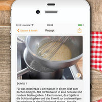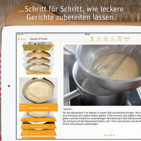 The universal App gives a list of ingredients illustrated with photos for each sauce, reminds you of its preparation time and notes the degree of difficulty. The photos by an expert food photographer show how delicious the results can look. The instructions for preparation are clear and precise. Each step has a photo showing how the intermediate results should look or when to use a new technique. Your successful recipes can be saved as Favorites or sent by email to a desktop computer.