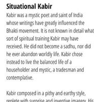 Kabir composed in a pithy and earthy style, replete with surprise and inventive imagery. His poems resonate with praise for the true guru who reveals the divine through direct experience, and denounce more usual ways of attempting god-union such as chanting, austerities, etc. Kabir, being illiterate, expressed his poems orally in vernacular Hindi, borrowing from various dialects including Avadhi, Braj, and Bhojpuri. Situational Kabir is our attempt to present these for application in today's world.