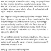 Situational Kabir the app has 4 main categories : Work, Relationships, Growing old and Soul, and several sub-categories. Carefully selected dohas with English translations are available in each category. The App goes on to suggest situations in modern life where these can come most useful.