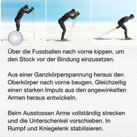 Still pictures with explanatory texts illustrate the crucial phases of the movement and help users improve their technique so as to ski more efficiently.